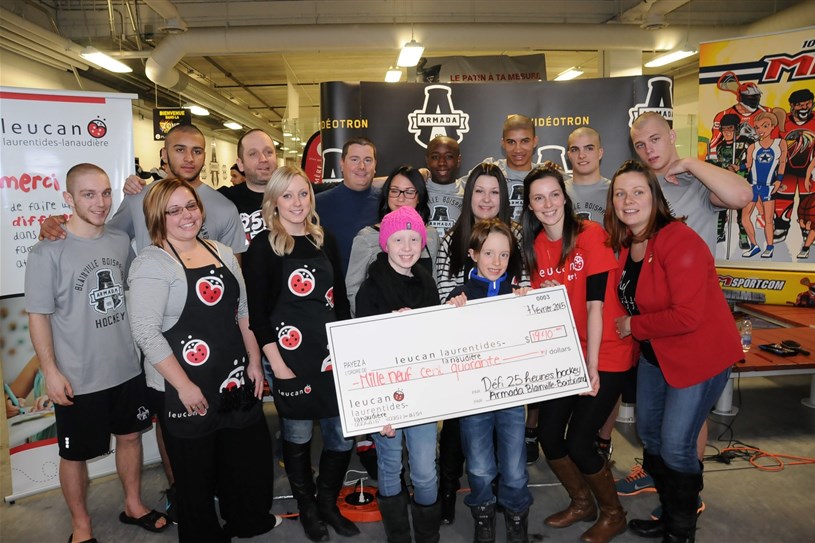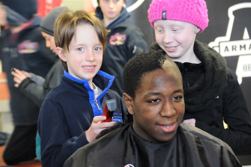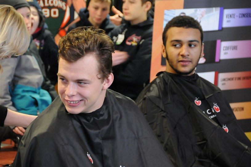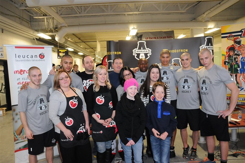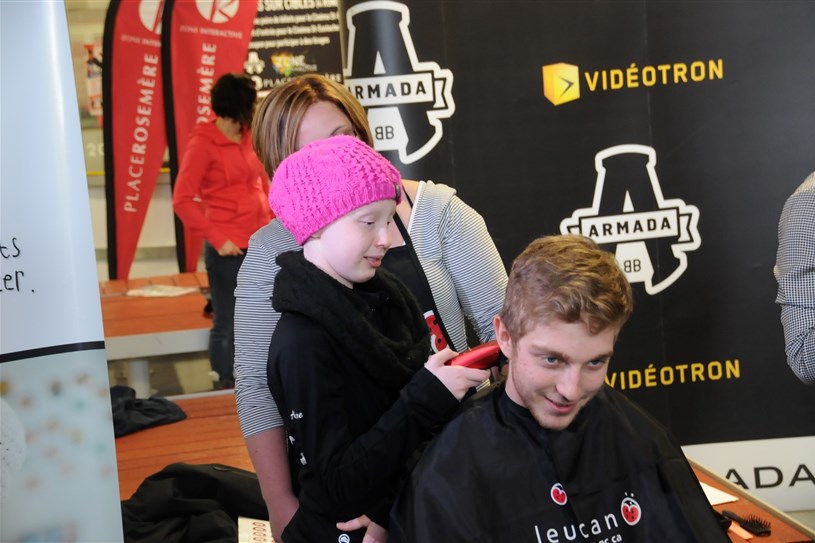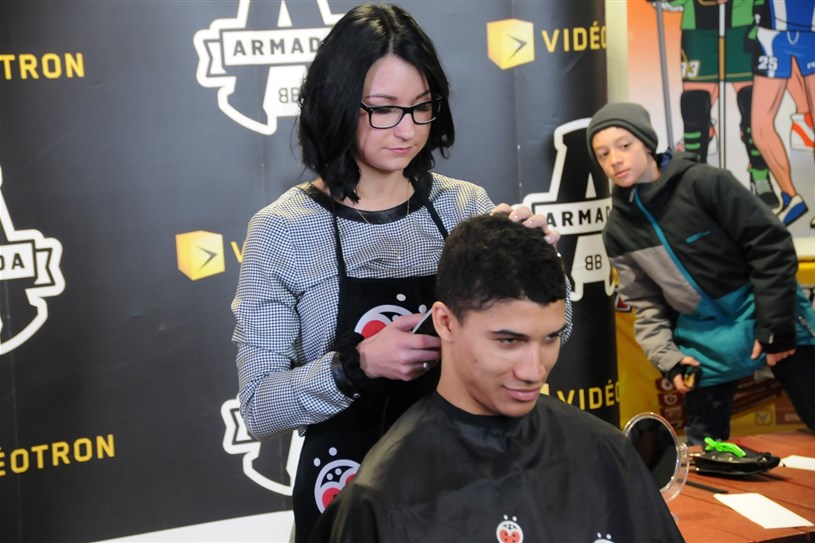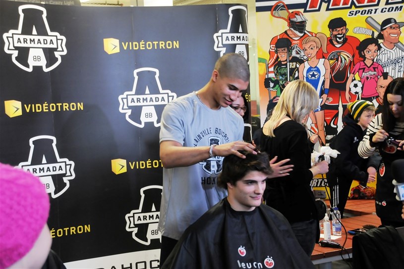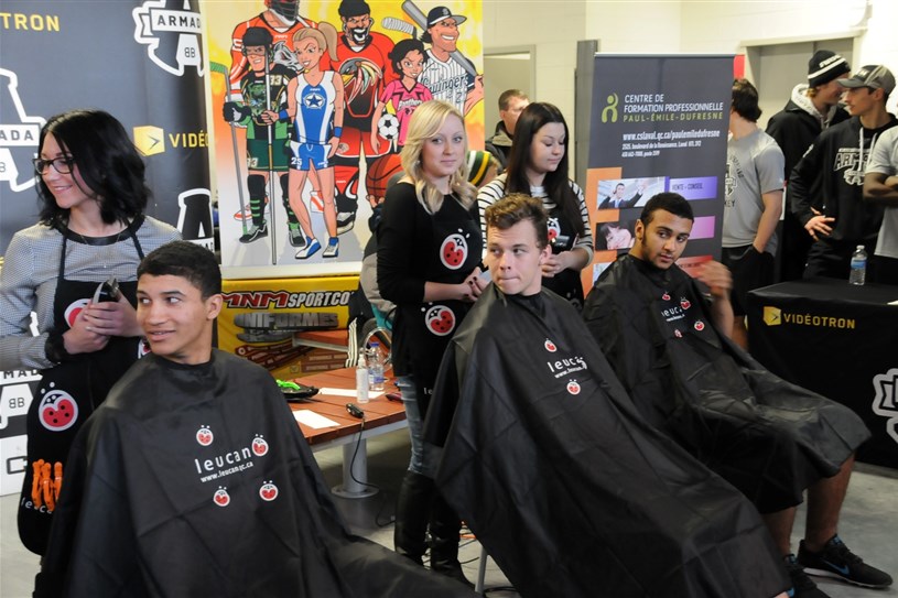 En plein cœur du week-end hockey de l'Armada de Blainville-Boisbriand, quelques joueurs de l'équipe ont décidé de se faire raser les cheveux pour soutenir Leucan, samedi après-midi.