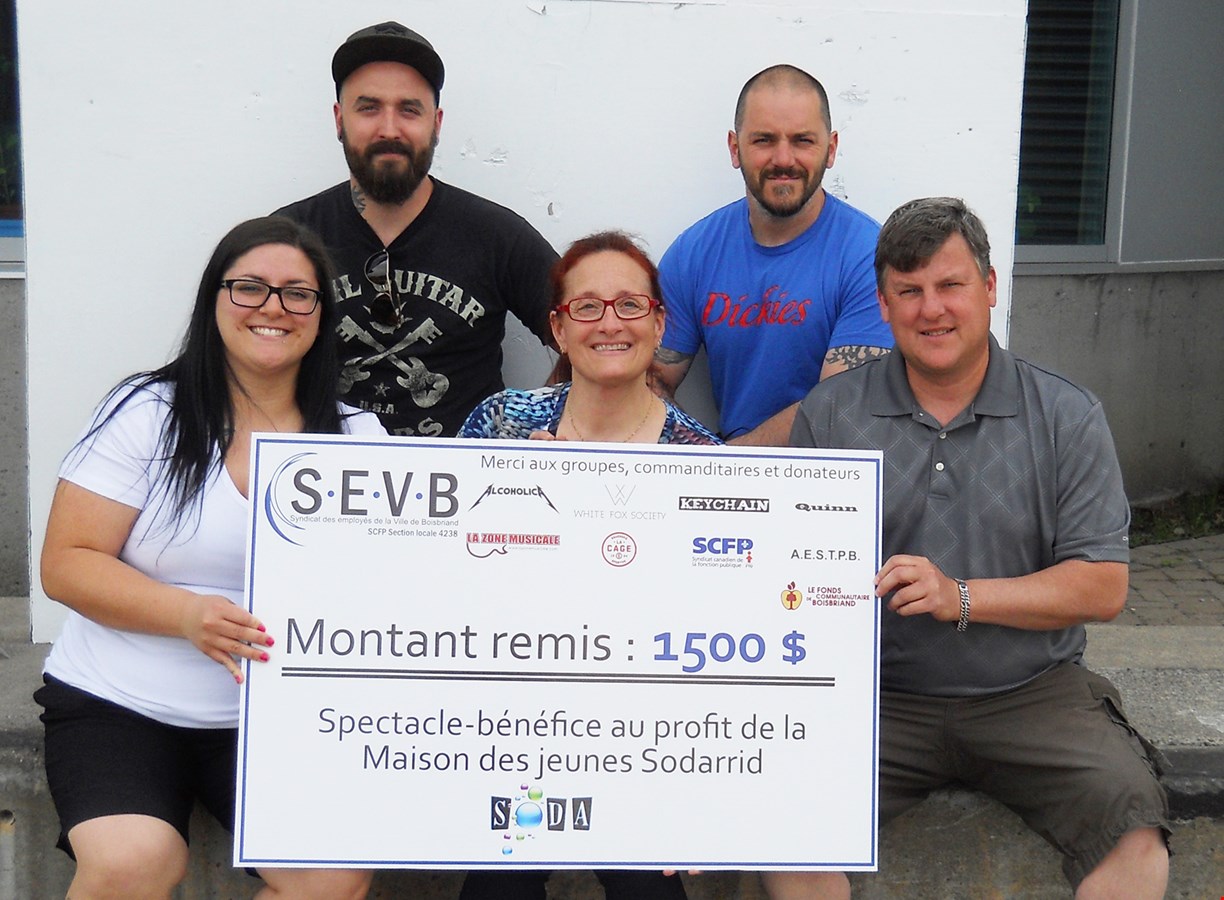 Depuis des années, le Syndicat des employés de la Ville de Boisbriand (SEVB) fait des dons à divers organismes, mais depuis un an, les membres de la section locale s'impliquent physiquement afin de redonner à la communauté. En novembre 2015, ils ont participé à la guignolée au profit des Services d'entraide le Relais et cette année ils ont organisé un spectacle-bénéfice au profit de la Maison des jeunes Sodarrid. Pour cette soirée, le SEVB a invité des groupes rock/métal, dont Alcoholica, groupe hommage à Metallica, en tête d'affiche ainsi que White Fox Society, Keychain et le groupe Quinn, un groupe d'étudiants de l'école secondaire Jean-Jacques-Rousseau. « C'était un gros pari, mais nous sommes fiers du résultat et du montant amassé ainsi que de l'implication des membres de notre section locale qui étaient bénévoles. », mentionne Éric Labelle, président de la section locale.