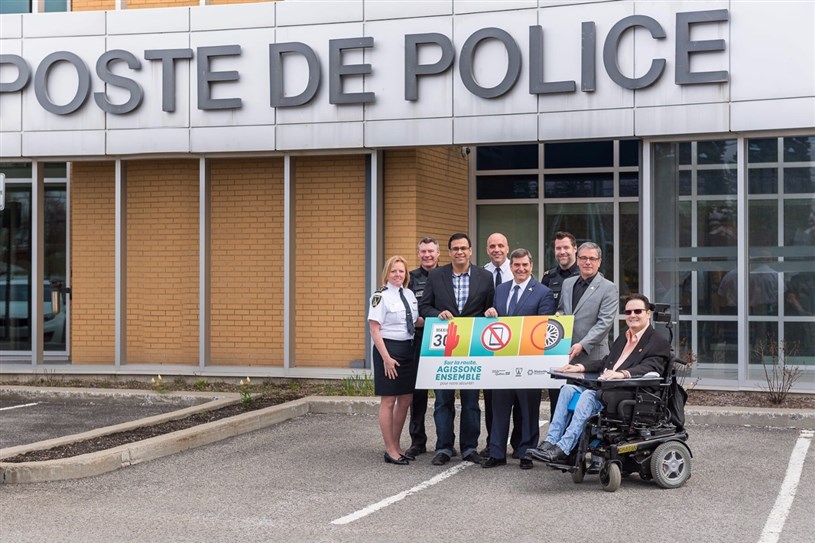 Linda Ouimet (directrice du Service de police), François Bourdeau (agent de police), Marouan Bel Fakir (conseiller régional en sécurité routière à la SAAQ), Yves Tessier (directeur adjoint aux opérations policières), Richard Perreault (maire), Daniel Boileau (sergent – division des relations avec la communauté), Guy Frigon et Alexandre Poce (respectivement président et vice-président de la Commission de la sécurité).