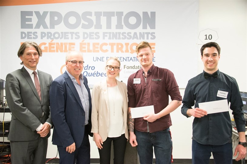 Sur la photo:  Le directeur général du Collège Lionel-Groulx, Michel Louis Beauchamp ; le président du conseil d’administration de la Fondation du Collège Lionel-Groulx, Paul Paré ; la conseillère en relation avec le milieu chez Hydro-Québec, Marie-France Barrette ; et les deux récipiendaires de bourse, Antoine St-Germain et Tommy Desrochers.