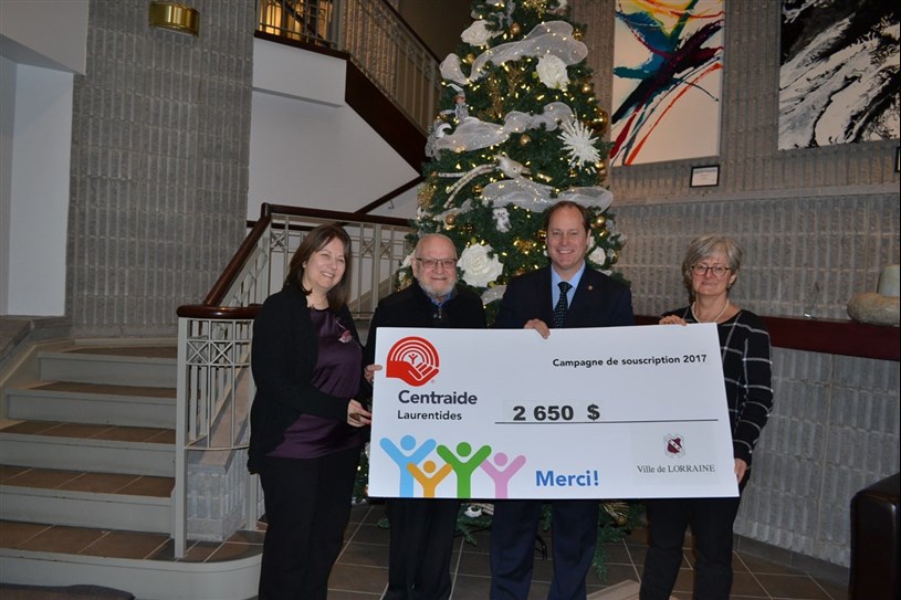 Chaque année, la Ville de Lorraine participe activement à la campagne de collecte de fonds de Centraide Laurentides. Pour l’édition 2017, elle a récolté 2 650 $ en six semaines, un montant record qui dépasse de loin l’objectif fixé à 1 900 $ !